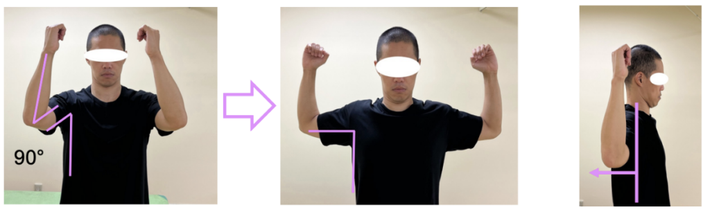 ①肘を90°に曲げた状態で、肩を前方に90°上げます(ガッツポーズを前に倒したような姿勢)。