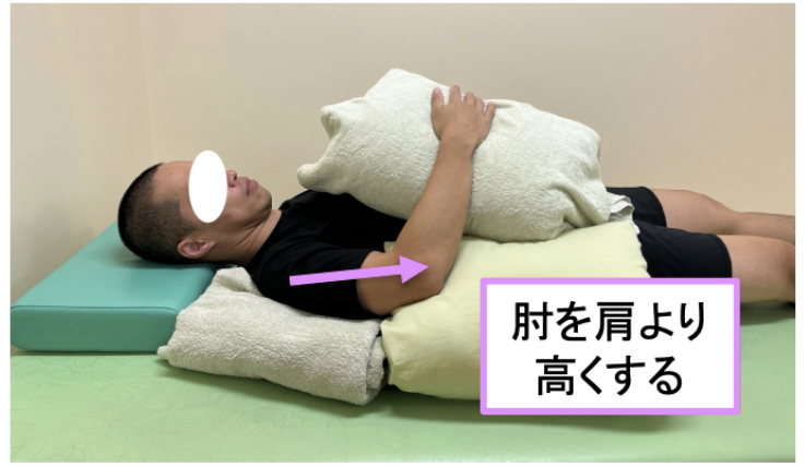 肘が肩より下がると痛みが出やすいので、枕や布団などで肘の位置を肩より高くした状態にします。