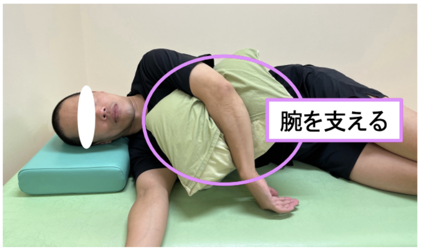 腕が床側に落ちると痛みが出やすいので、抱き枕などで痛みがある側の腕を支えます 。
