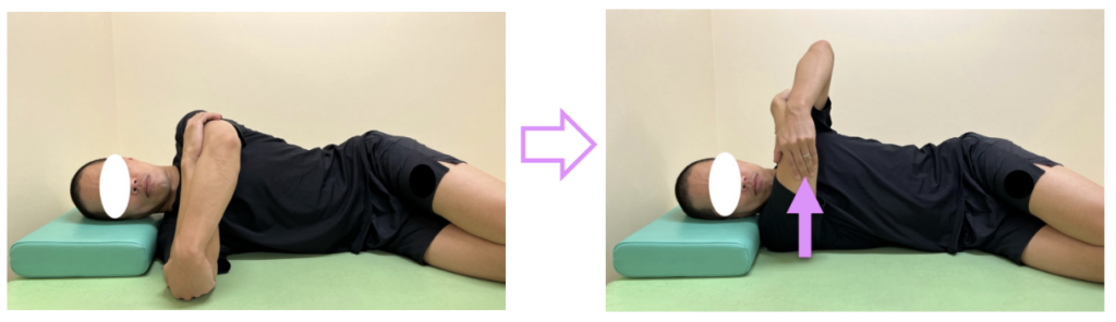 ③曲げている肘を反対の手で掴み、天井方向(上)へ持ち上げます。