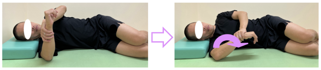 ③反対の手で、肘から手首までの腕を床へ近づけるように倒します。