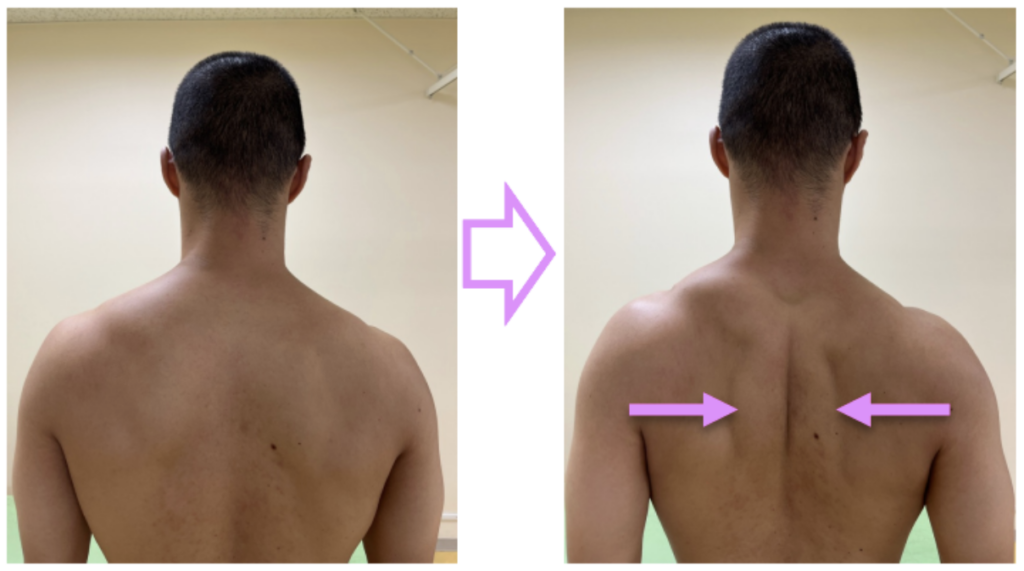 ① 内転運動:胸を開くように肩甲骨を内側へ寄せ、元の位置へと戻します。